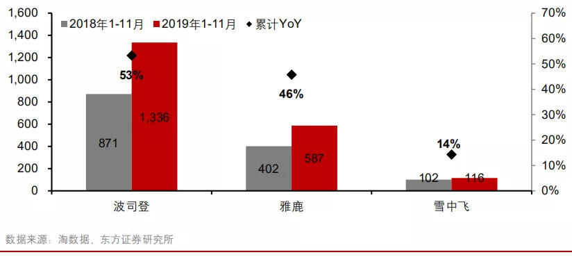 东方证券的报告显示,2019年11月,波司登、雅鹿、雪中飞在天猫店铺的销售额分别为9.09亿、2.89亿、0.63亿,分别同比增长43%、38%、73%。2019年1月-11月,波司登、雅鹿、雪中飞在天猫店铺的累计销售额分别为13.36亿、5.87亿、1.16亿,分别同比增长53%、46%、14%。