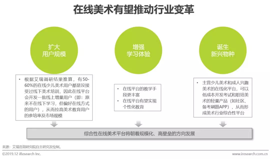 自从互联网于20世纪90年代末传入中国后,中国的通信、传媒、娱乐、金融、教育、医疗、农业、制造等行业都发生了深刻的变革,美术教育培训行业也不例外。传统美术教培机构具有“小”“散”“乱”的特点,在线美术平台的出现导致整个行业从一个已知的、固化的市场,逐渐转变为充满变数的市场。随着网络和科技的持续渗透,美术教育这一垂直行业未来将诞生若干综合性平台,这个平台有望聚集全年龄段的美术教育用户,增强其学习体验,并在用户认可度上不断强化,而且,由于其专业特性强、用户圈层封闭,未来教培巨头和互联网巨头也很难对它在业务上造成冲击。