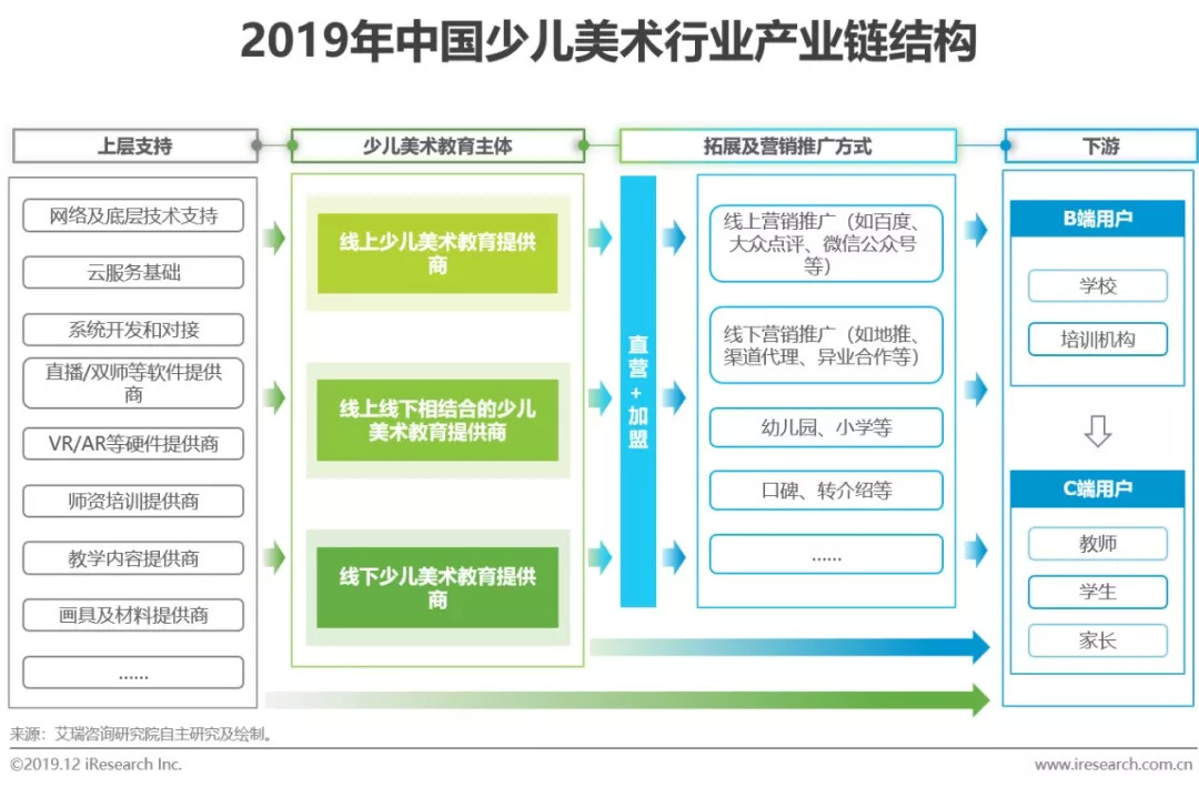 美术教育培训行业为各个年龄段的用户提供美术启蒙/应试/就业/兴趣培养等方面的培训服务,其范畴远超过一般人认知中的“少儿绘画培训”。2019年,我国美术培训市场规模在900-1050亿元之间,其中青少儿美术培训是主体,其占整个美术培训市场的比重超过80%。青少儿美术培训市场因用户基数大、参培率低、客单价低等因素在未来有很大的市场空间可供深挖,预计未来几年有望成长为千亿市场行业。