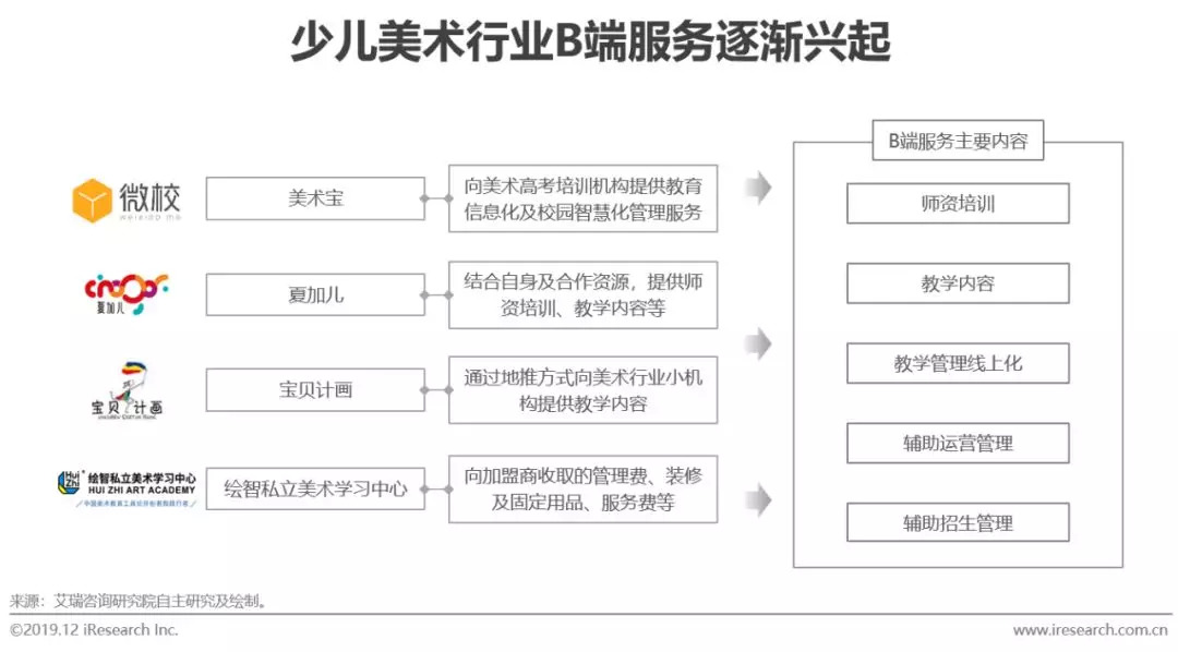 现阶段少儿美术机构按照经营方式分为线下、线上+线下和线上三种。无论何种模式,向C端用户收取课程及服务费是主流,而向B端提供付费服务的方式则略有差别。线上少儿美术机构运营模式相对较轻,对市场敏感度也高,故为B端少儿美术机构提供的服务更前卫化,多集中在提升管理和服务效率等方面。线上+线下的企业则更多集合自身优势以提供师资培训、教学内容为主。线下少儿美术机构除了可以提供师资培训和教学内容服务外,他们丰富的运营管理经验使得他们在品牌扩张过程中可以向加盟商收取运营管理等费用。