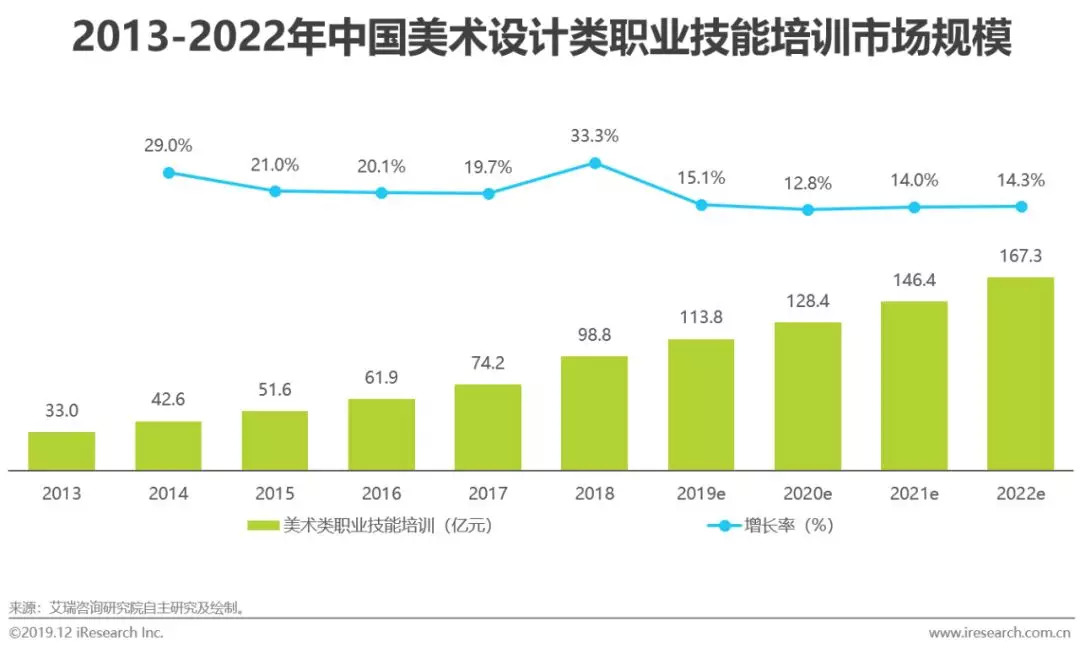 据艾瑞统计及核算,2019年中国美术设计类职业技能培训市场规模达113.8亿元,同比增长15.1%,未来几年市场将维持在13%左右的增速持续增长,预计2022年市场有望突破160亿元。美术设计类职业技能培训市场持续增长主要有以下几点原因:1)政策利好,国家大力扶持文化类产业,与美术相关的产业将得到长足发展;2)新兴技术不断涌现并且与人们休闲娱乐相结合,市场整体对影视、游戏领域类美术相关的人才需求强烈,就业空间大。