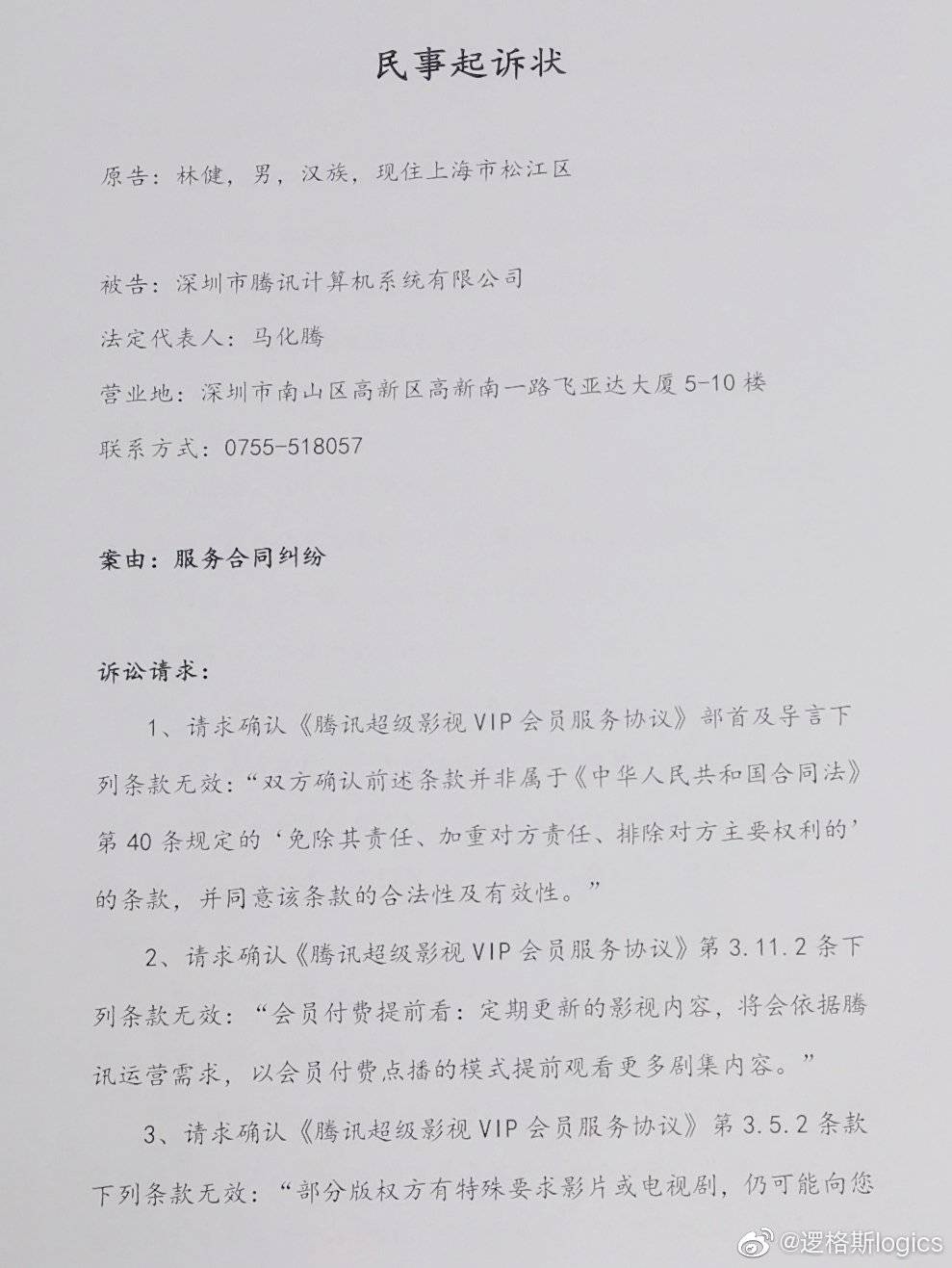 “这段时间在腾讯追《庆余年》,本来会员提前看功能用得好好的,结果突然冒出一个‘超前点播’,顿时感觉像吃了苍蝇一样恶心。身为法律人,我马上翻出了《腾讯超级影视VIP会员服务协议》,然后再一次感到生理上的不适。”律师林健在微博上表达了自己作为腾讯视频会员的使用体验,并将这种不满和愤怒诉诸了法律,要求确认腾讯视频超级影视VIP会员服务协议下的多条条款,并赔偿经济损失500元。