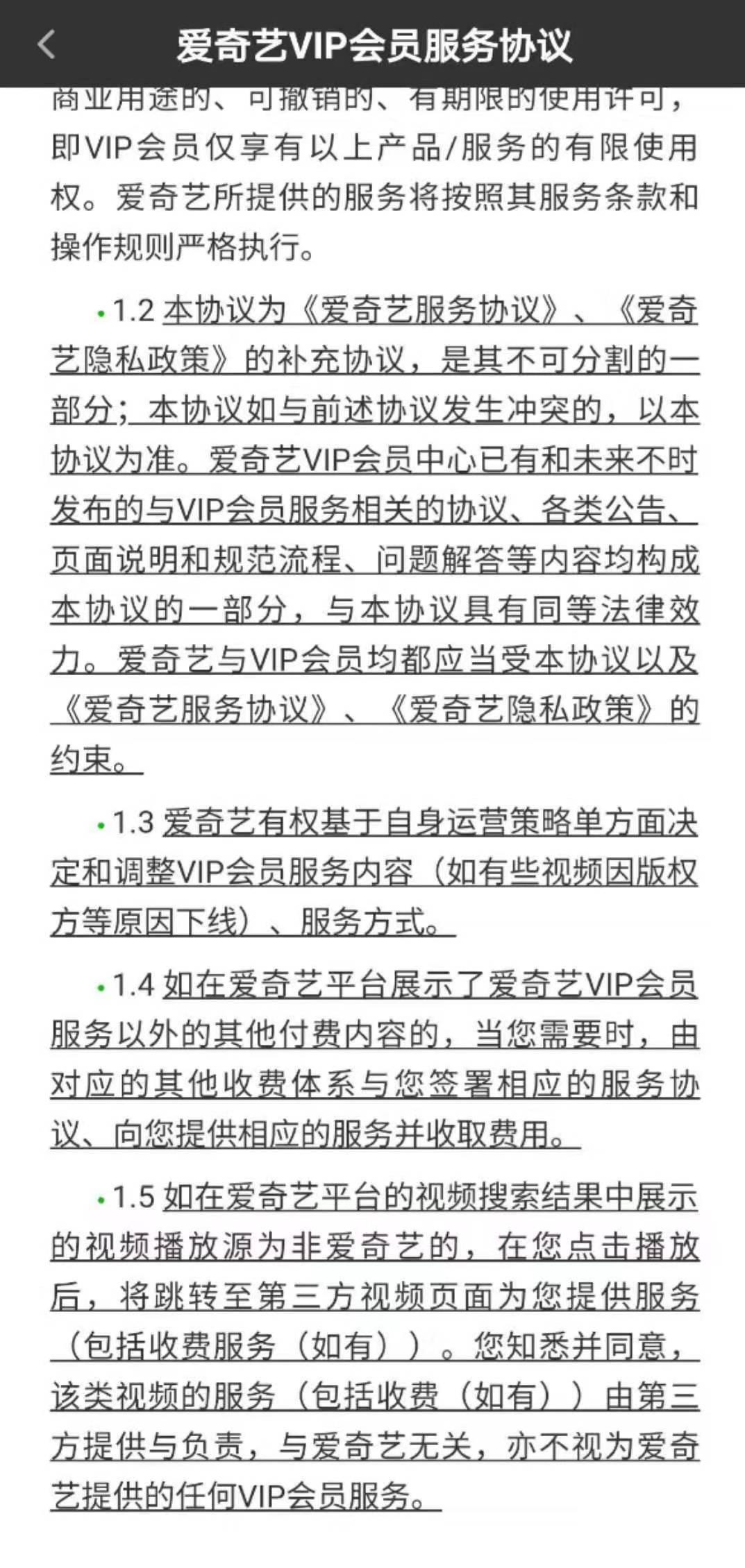 林健律师告诉界面文娱,他认为腾讯视频会员协议的不合理之处在两个方面,“一个是提供服务中存在欺诈,即实际提供的会员服务,与其宣传的会员服务不符;一个是部分格式条款无效,主要的一条是‘约定用户继续使用视为接受协议修改’”。