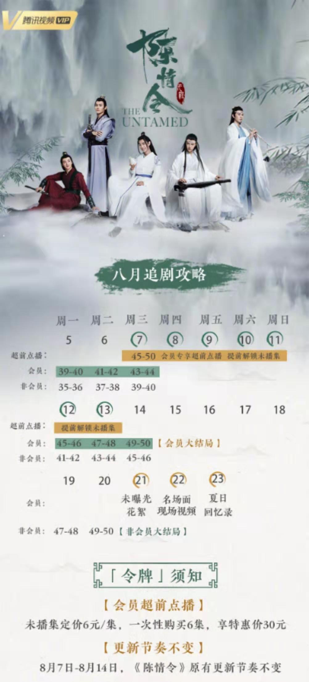 这部2019年的爆款网剧,6月27日在腾讯视频播出后,点播量和微博的话题热度一直高居不下,《陈情令》和《庆余年》一样,原本都是每周更新六集,到8月剧集将完结之时,腾讯视频提前在线上放出了《陈情令》大结局,只不过要看提前释放的5集,需要从普通的VIP花费18元升级为超级VIP才可观看,而在升级为超级VIP后,腾讯视频又提示单集付费6元才可观看大结局。