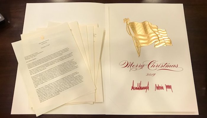 综合俄罗斯卫星通讯社、《国会山报》报道,当地时间18日,白宫给美参议院议员送去圣诞贺卡,外加美国总统特朗普写给美众院议长佩洛西长达6页的信件。