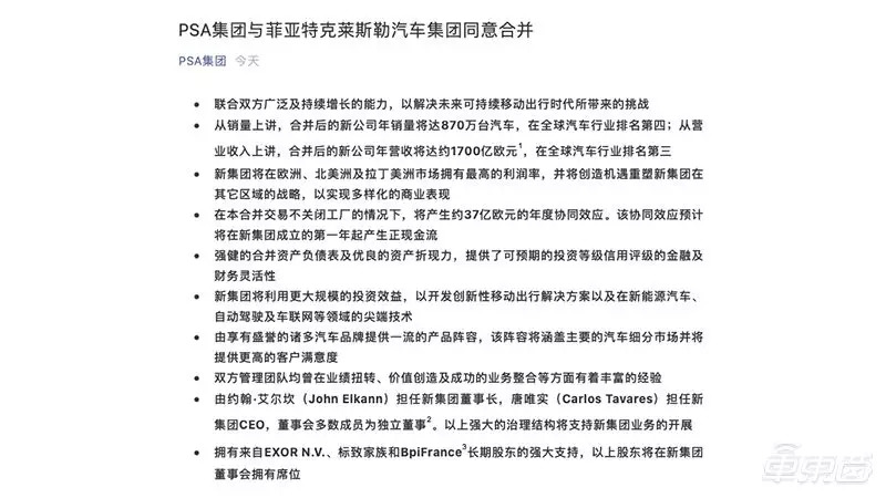 ▲PSA集团发布双方同意合并的公告