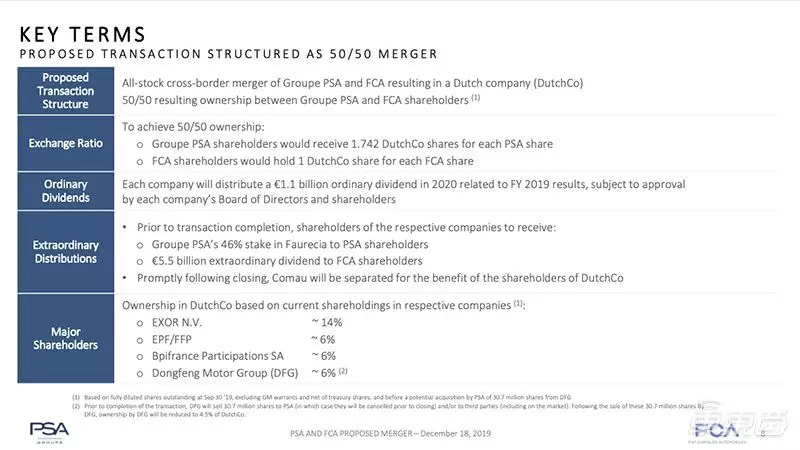 在本次交易完成之前,PSA集团将向PSA股东提供46%的佛吉亚(Faurecia)公司的股份;FCA股东则会收到55亿欧元的特别股息。
