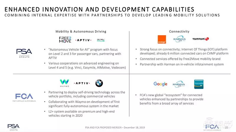 在智能网联方面,PSA与FCA各自拥有业内领先的合作伙伴。