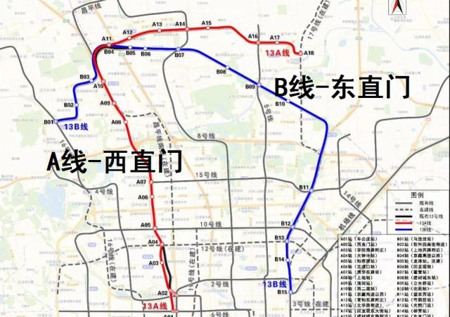 拆分后,13A线起点变为车公庄站,终点至在建17号线的天通苑东地区。13B线延伸至上地软件园换乘16号线,终点至16号线马连洼站。