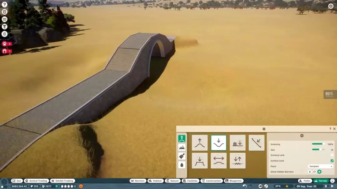 《动物园之星》的沙盒建造元素丝毫不弱于模拟经营:通过内置的笔刷功能,可以塑造任何想要的地形,甚至可以利用沙盒的特点,建造一个违反物理常识的浮空岛屿。