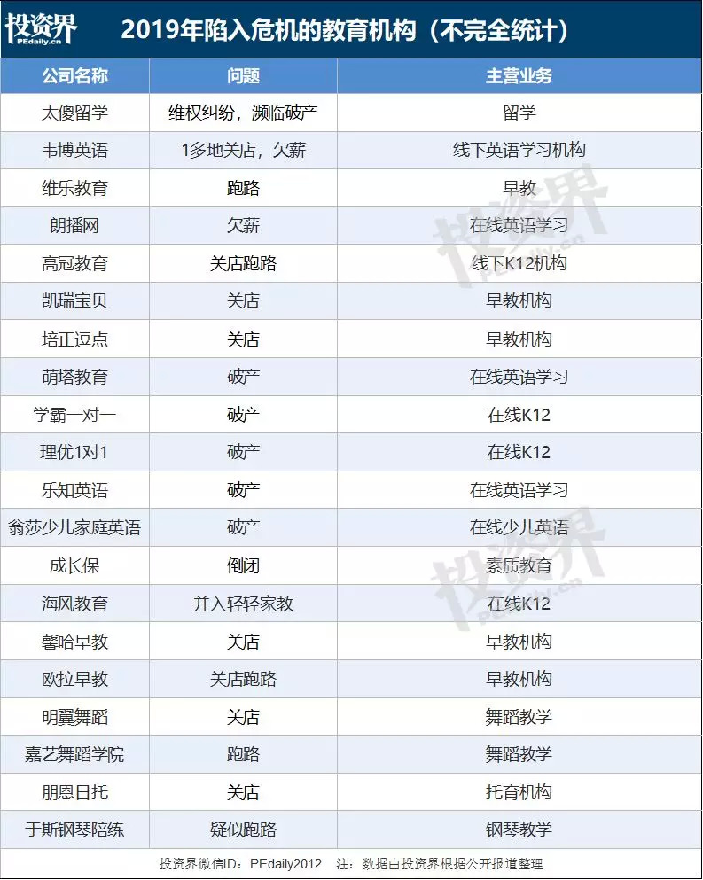今年以来,一系列教育培训机构关门、跑路事件层出不穷,给这个行业蒙上一层阴影,投资界梳理了一些较为知名的案例:
