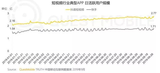 这种焦虑还来自与抖音的竞争。QuestMobile的数据显示,抖音9月末的DAU为2.77亿,虽然抖音的DAU也在浮动,但从数据上看,快手与抖音的日活用户数仍然有较大差距。具体而言,快手和抖音之间的日活差距从今年1月的0.62亿,进一步拉大到9月底的1.06亿。