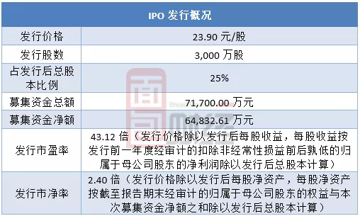 公司IPO发行3,000万股,发行价格23.90元/股,募集资金总额71,700.00万元。扣除发行费用后,募集资金净额64,832.61万元。