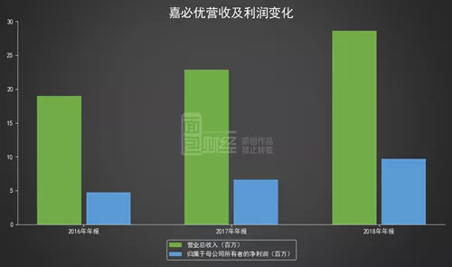 年度财务数据显示,2016年、2017年及2018年,嘉必优营收分别为1.9亿元、2.29亿元及2.86亿元,归母净利润分别为4696.34万元、6577.91万元及9698.6万元。2017年及2018年,公司营收增速分别为20.42%及25.18%,归母净利润增速分别为40.06%及47.44%。