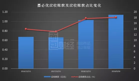 近年来,嘉必优应收账款逐年攀升。2017年到2018年,公司应收账款由6631.25万元增加至1.03亿元。到2019年三季度末,进一步增长至1.14亿元。