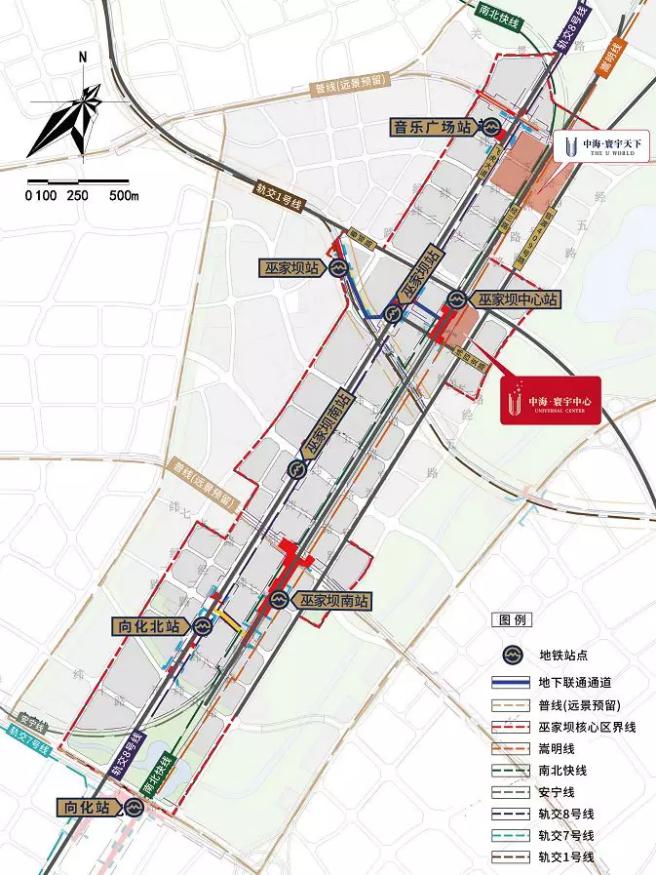 中海寰宇中心,位于巫家坝中心站地铁上,地下室与站点直接接驳。与5号线联通换乘,是真正地铁上盖的物业。并且除了地铁,中海寰宇中心还享有五横四纵的立体交通路网,500 米范围内公交站点全覆盖,中海寰宇中心就是巫家坝CBD的交通枢纽核心。