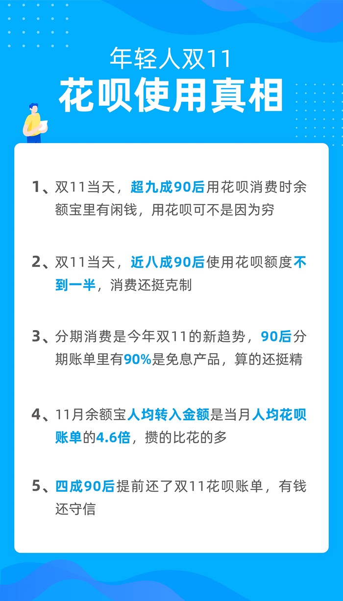与此同时,巧妙利用花呗41天免手续费政策的年轻人也很守信用:“凭本事用的花呗,也凭本事还。”他们不仅按时还款,还有四成90后在每月定期的还款日前就把双11当月账单还清了。