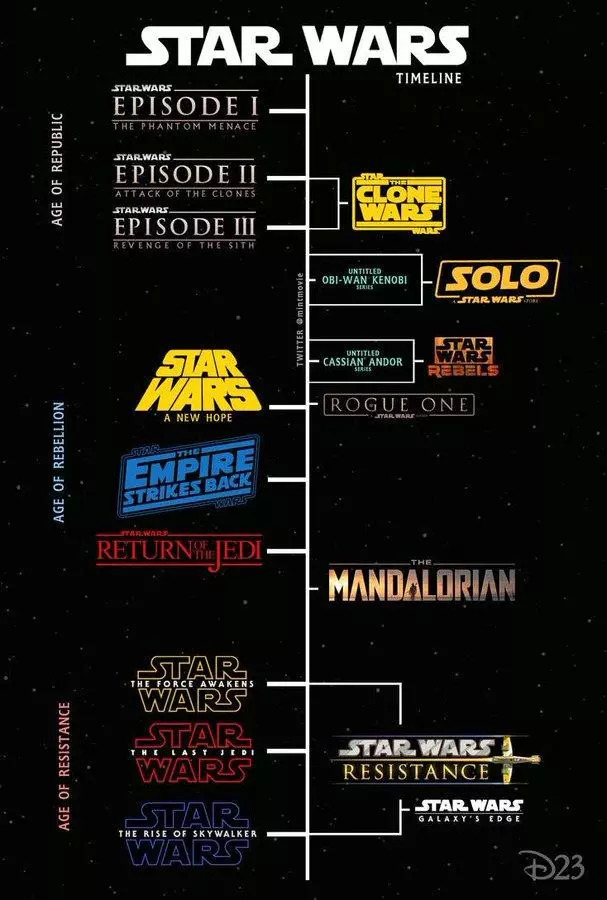 ↑其中“原力觉醒”“最后的绝地武士”和“天行者崛起”是“新三部曲”,“侠盗一号”和“游侠索罗”是两部外传,《曼达洛人》是Disney+刚刚上线的美剧。片名到此统一了,新三部曲被称为“星战7”“星战8”“星战9”。