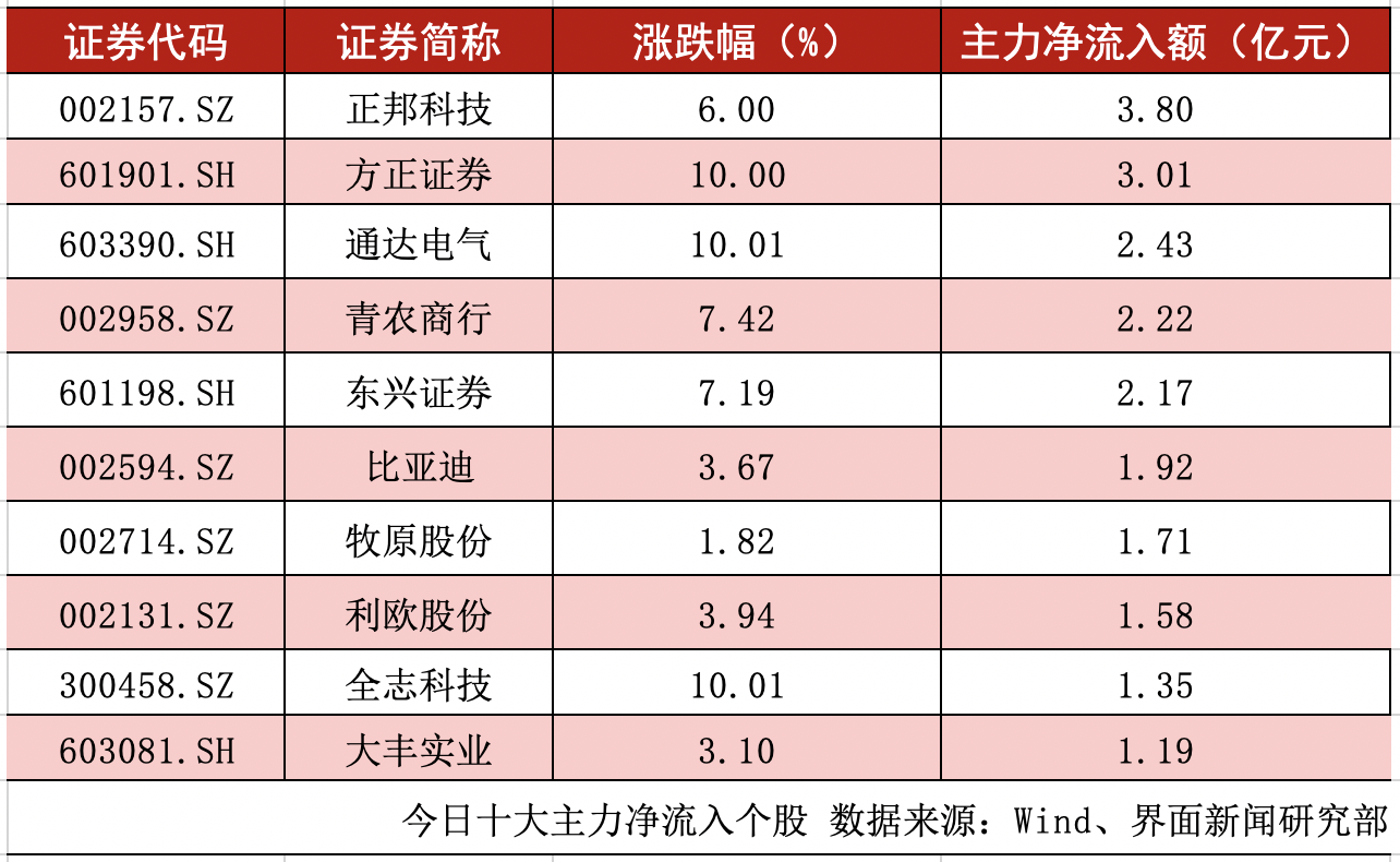 剔除尚未开板的新股及科创板股票,全天沪深两市主力净流入额超过1亿元的个股数量为14个。正邦科技(002157.SZ)、方正证券(601901.SH)、通达电气(603390.SH)的主力净流入额位居前三,分别为3.80亿元、3.01亿元、2.43亿元。