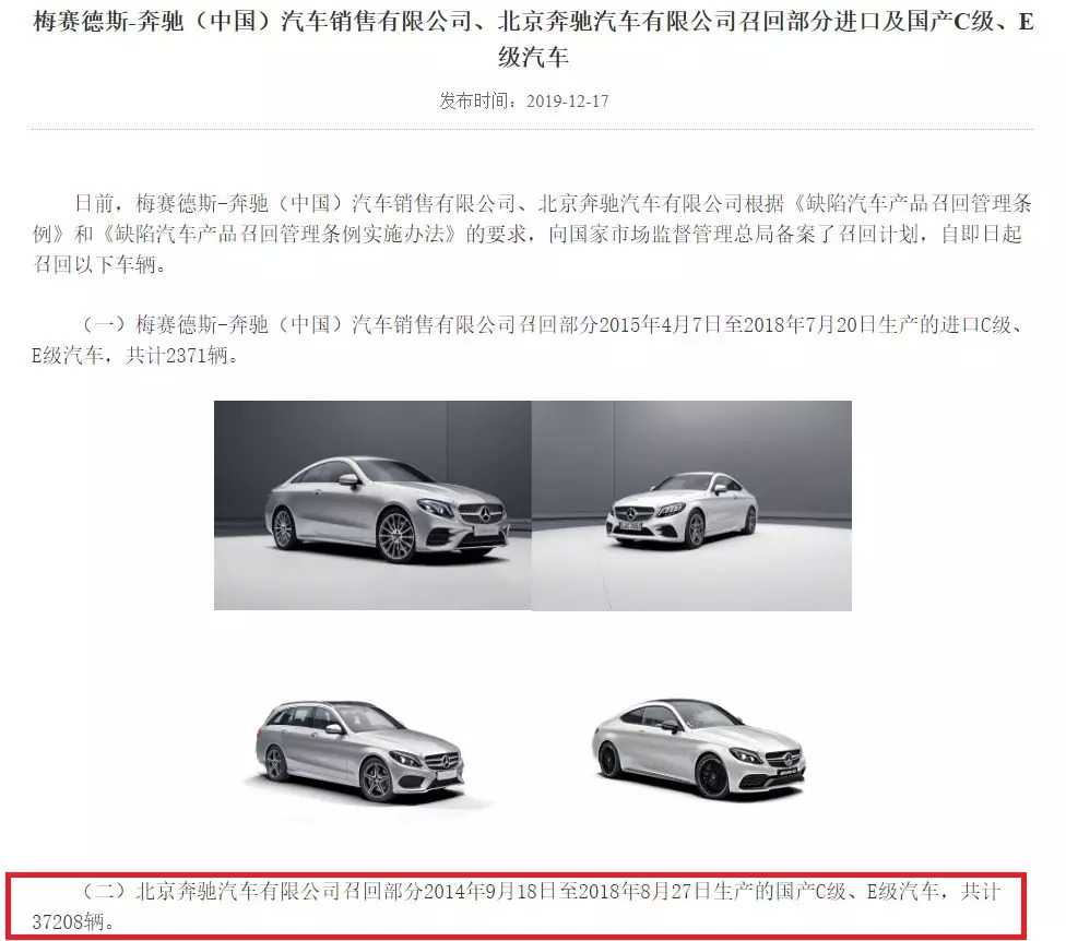 12月17日,市场监管总局公布5则汽车召回通知,奔驰独占其三。其中,北京奔驰E级继11月12日被召回超过31万辆后,再涉安全隐患问题被召回。
