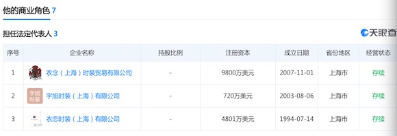 天眼查信息显示,宇旭时装(上海)有限公司(以下简称“宇旭时装”)生产为有限责任公司(台港澳法人独资)、注册资本710万美元、2003年8月成立,其法定代表人CHUNG SOO JUNG,同时也是衣恋时装(上海)有限公司和衣念(上海)时装贸易有限公司的法人。而衣念(上海)时装贸易有限公司注册于2007年11月1日,前身是韩国企业E.LAND WORLD LTD于1994年在中国注册成立的衣恋时装(上海)有限公司。