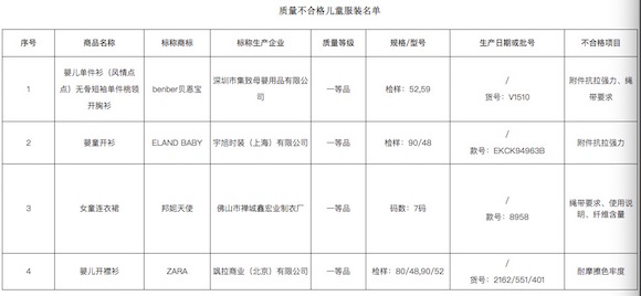 12月20日,天津市市场监督管理委员发布儿童及学生用品质量抽检公告,检出ELAND BABY、ZARA等四个品牌的儿童服装存质量问题。