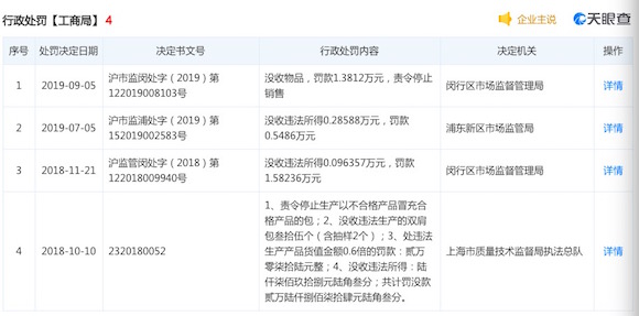 据天眼查信息,宇旭时装曾多次因质检不合格被市场监管部门处罚。天眼查信息显示,自2018年10月至2019年9月间,该公司四次受到行政处罚。