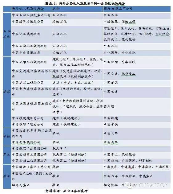 兴业策略认为,从打造国际竞争优势的角度提出,海外业务收入高且属于同一业务板块的央企合并可能性相对更高,包括军工、机械、航运、船舶制造、建筑、石油石化等。南北车已经合并、中远集团和中国海运集团旗下上市公司已经集体公告停牌。后续,可持续关注合并可能性。另外,核电行业国家核电和中电投集团层面已经合并为国家电投集团,可关注下属上市公司资产整合的可能性。