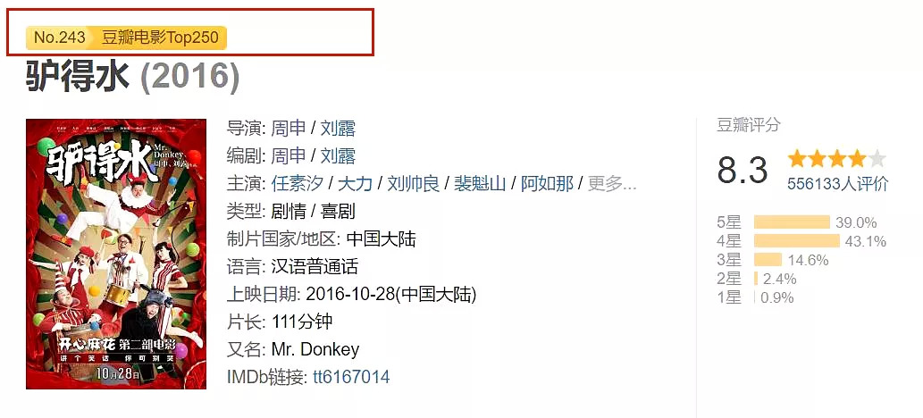 要知道在过去整整10年的时间里,在豆瓣上评价人数超过五十万,并且杀进过 TOP250的华语电影,一共只有三部,[驴得水]便是其中之一(其余两部是[让子弹飞]和[我不是药神])。