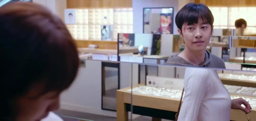 孙同和莫默在店里配眼镜的那段戏很有意思,巧妙地利用了镜子,将错位摆在面儿上:男女双方的脑袋下是对方的身躯,也为两人接下来的深入交往埋下伏笔。