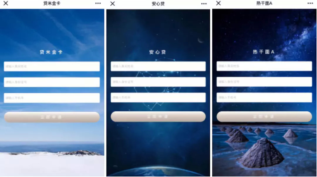 除了产品名称不同,这些链接的页面极其相似,输入姓名、身份证号、手机号即可申请贷款,有的链接隔一段时间就会显示页面加载失败。