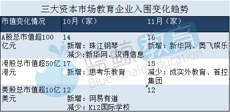 通过对比10月份与11月份所有教育企业总市值之和,发现整体股价下行,市场或将进入一个观望期,有持续盈利能力的企业板块就备受关注。
