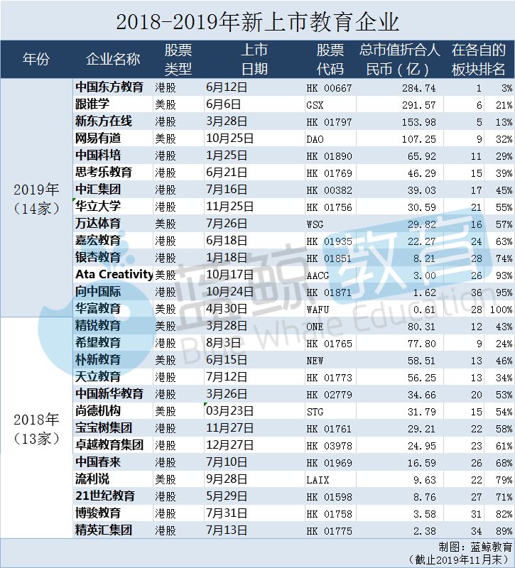 下图是蓝鲸教育智库整理的2018年至2019年期间,不完全统计的上市企业名单,以及截止2019年11月的总市值和在各自的板块排名。