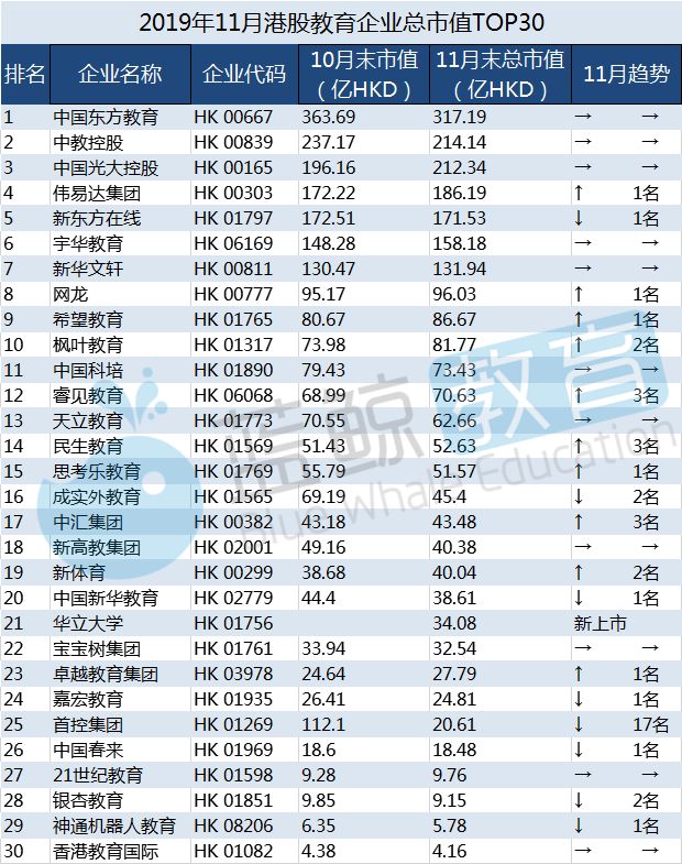 港股大盘整体略有下降,排在第一的中国东方教育(HK 00667)较上月市值下降13%,但仍是TOP1,中国东方教育也是2018至2019年上市企业里的龙头,11月市值达284.74亿人民币。中教控股(HK 00839)、中国光大控股(HK 00165)保持在二、三名;港股总市值超100亿港元的企业有7家。