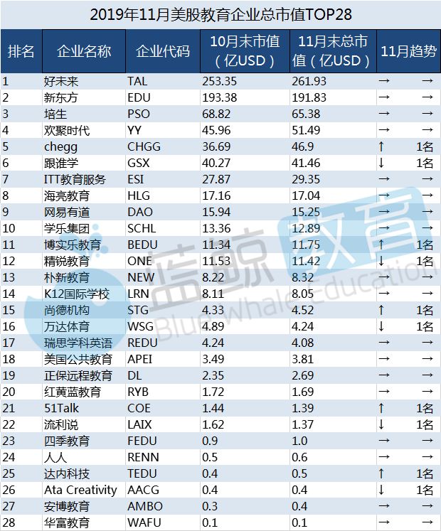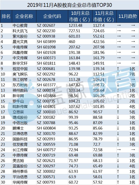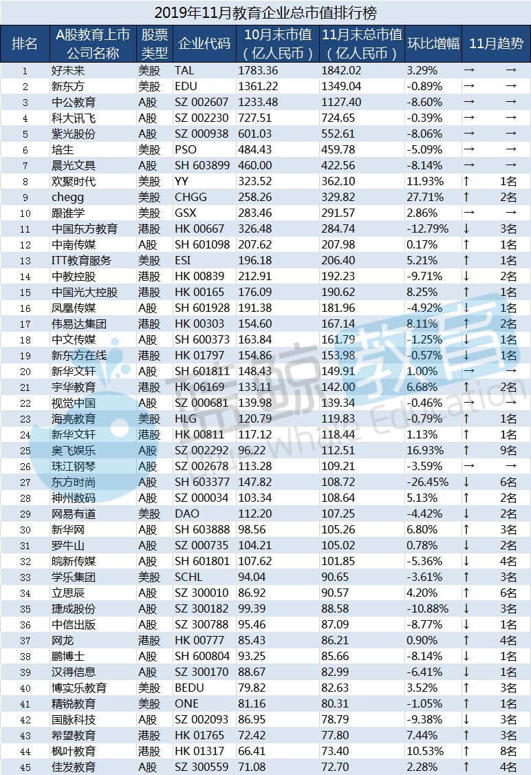 教育是一块巨大的市场,随着近几年教育行业的产业化发展和资本化发展,国内A股纷纷转型,境外教育企业也正在经历上市热,教育是一个永不会衰退的行业。最近几个月,教育上市企业经历了暑假大规模招生,开学季,又逐步进入即将到来的考试季,在刚刚过去的11月,各家教育上市公司市值表现又如何呢?
