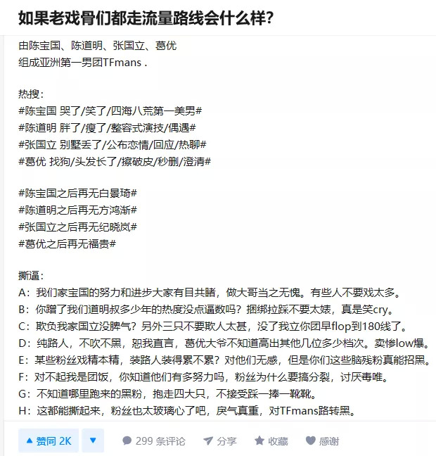 知乎上有个名为“如果老戏骨们都走流量路线会什么样?”的帖子,网友脑补出了由陈宝国、陈道明、张国立、葛优四人组成的亚洲第一男团TFmans ,而且还想好了热搜话题和饭圈互撕的理由。