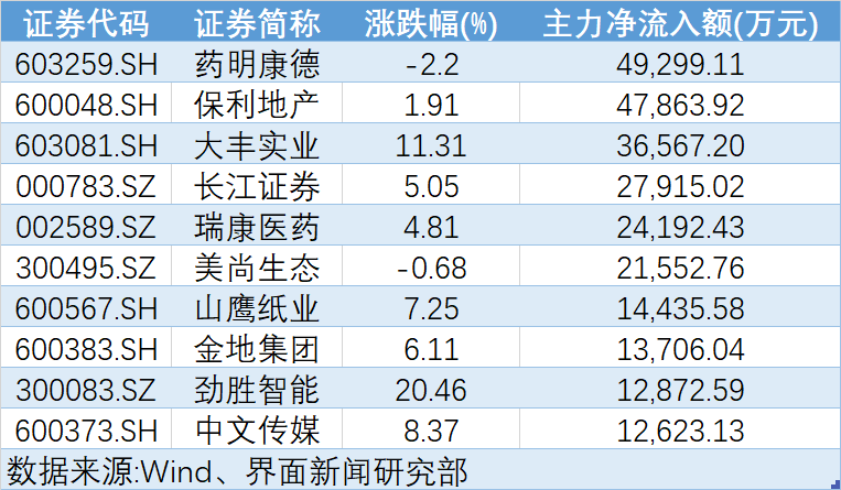 Wind提供的数据显示,本周获主力资金持续净流入且五日累计净流入额超过1亿元的个股共有13只,与上周持平。其中,药明康德(603259.SH)、保利地产(600048.SH)、大丰实业(603081.SH)本周累计净流入额居前,分别为4.33亿元、4.79亿元、3.66亿元。