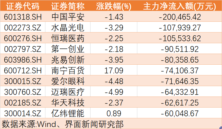 在本周主力资金持续净流出个股中,共计82只个股累计主力资金净流出额超过1亿元,较上周增加24只。这其中,中国平安(601318.SH)、水晶光电(002273.SZ)、恒瑞医药(600276.SH)等个股本周遭主力抛售幅度最大,其累计净流出额分别为20.05亿元、10.79亿元、10.55亿元。
