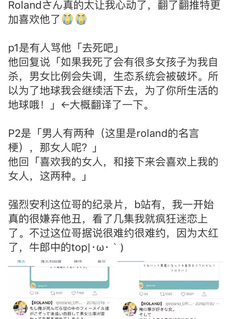 在国内社交网络,罗兰捆绑的热词是自恋、奇葩和中二。可网友的吐槽也为罗兰积攒了不小热度,硬糖君整理时发现,“日本牛郎Roland名言片段”等古早视频全网播放超千万。