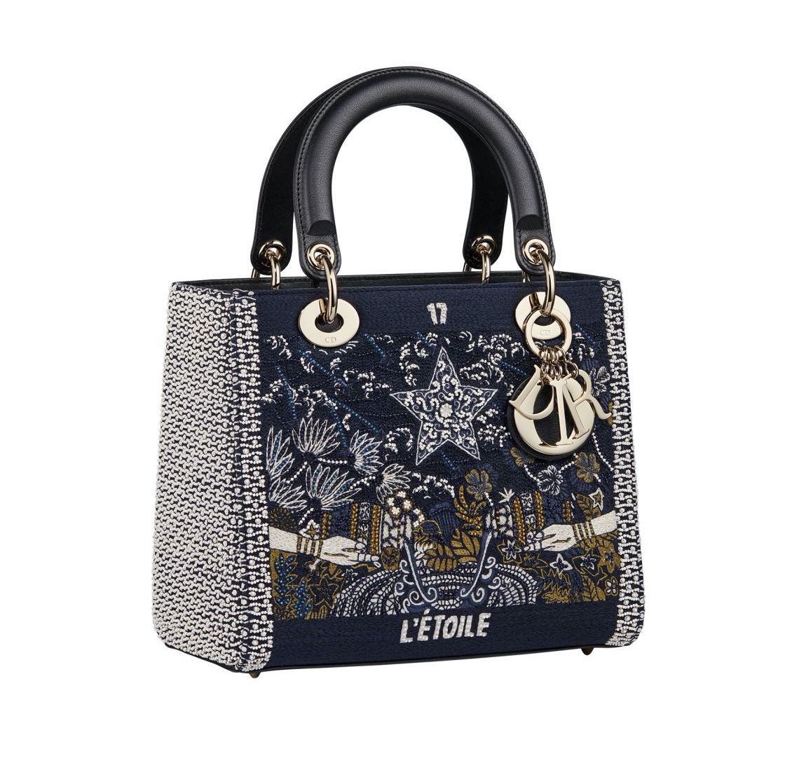 标志性的LADY DIOR包袋以深蓝为底色,搭配具有仪式感的白色五角星以及花卉图案,呈现出节日前夜人们祈祷幸福的画面。一系列珠宝配饰用打磨光滑的金色星星、珍珠与宝石作为装饰,灯光照射下闪烁的效果让人想到圣诞前夕东京六本木街道上璀璨的灯火。