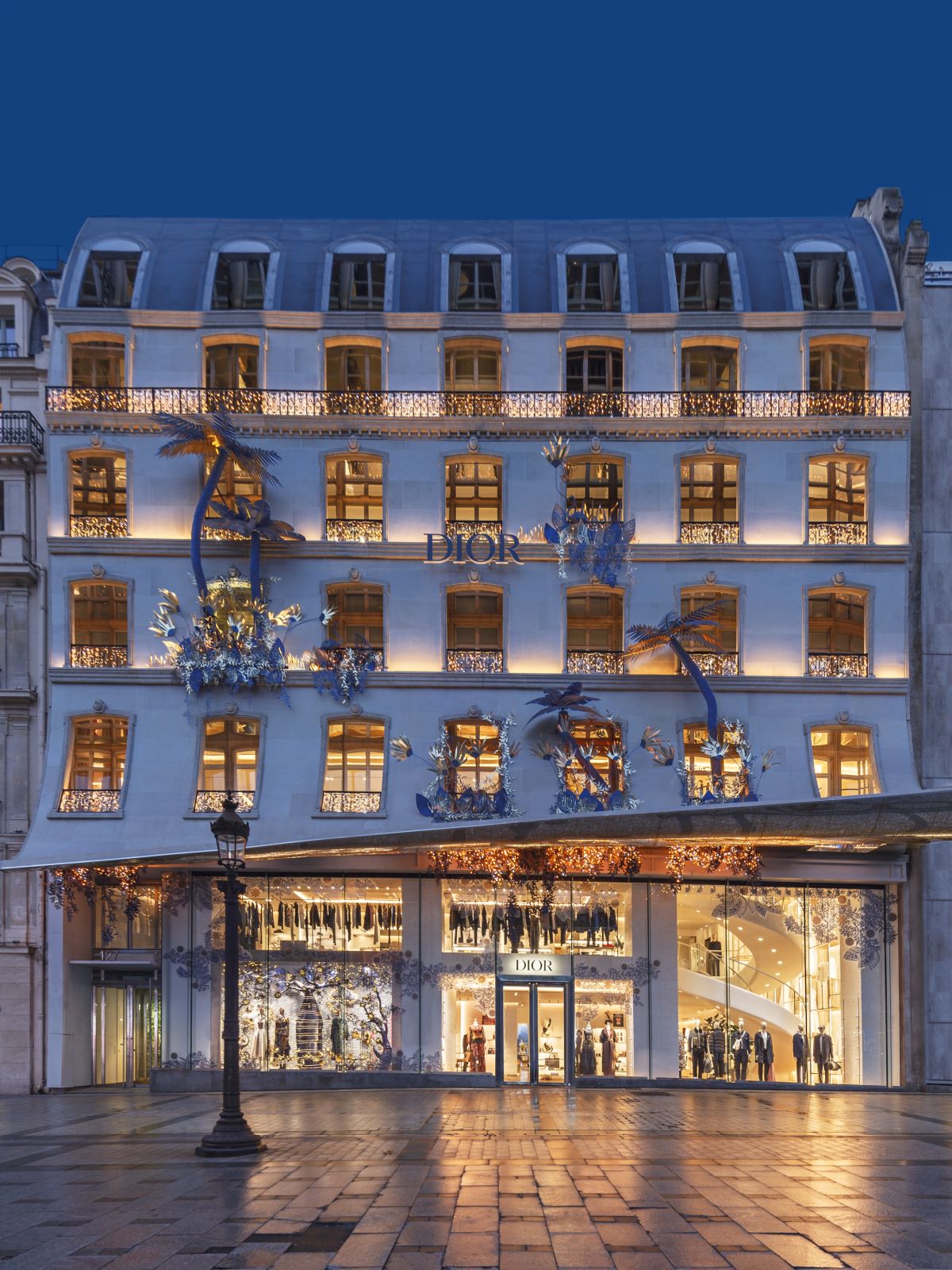 这种假日氛围在Dior位于巴黎香榭丽舍大街37号的旗舰店中展现得更为极致。店铺的节日橱窗采用应和圣诞氛围的白金色色调,中央的一棵猴面包树延展出金色的枝叶,树干以亮金与海蓝色的绸缎包裹,烘托出宁静而愉快的节日气氛。