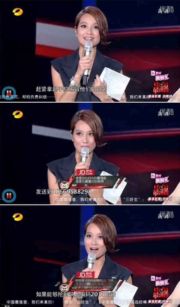 《中国最强音》总决赛,不知是不是突然蓝魂附体,朱丹把湖南台的短信号码“1066958820”念成了老东家浙江卫视的“10669588298”,按照朱丹的指示给湖南台发短信的观众,收到了浙江卫视的短信回复。