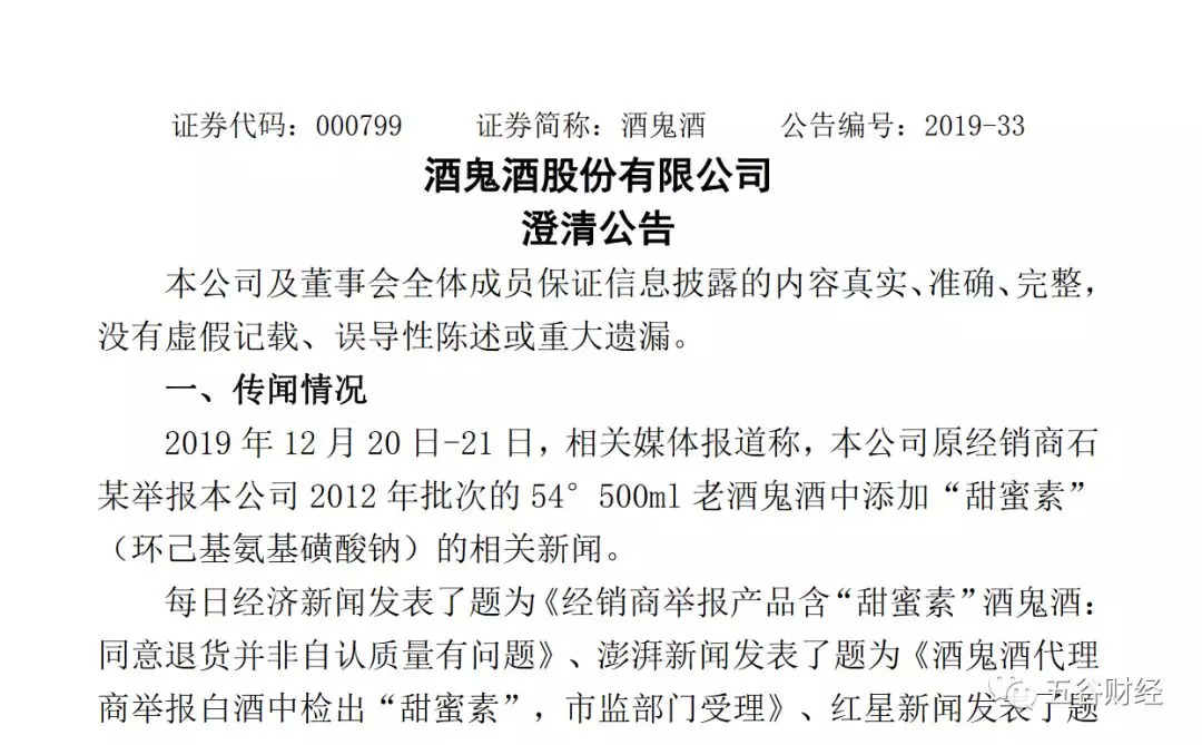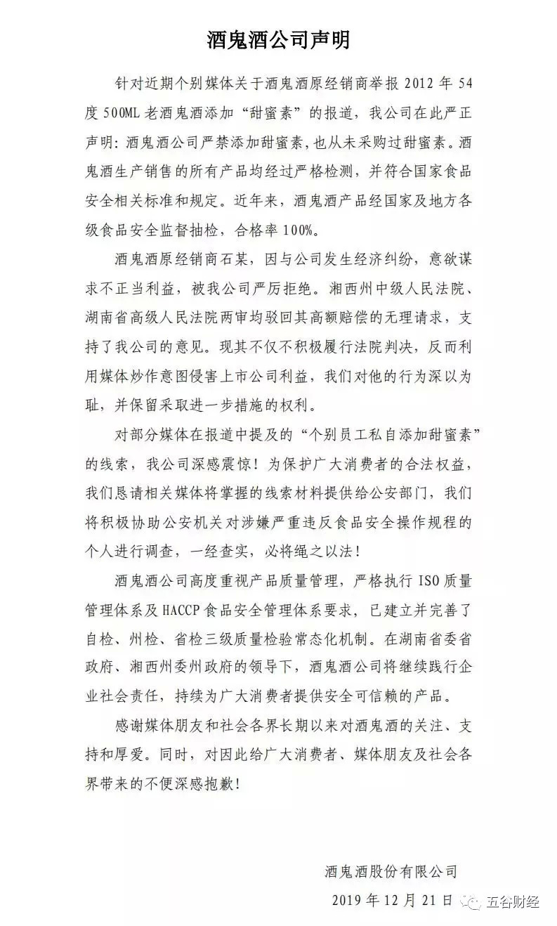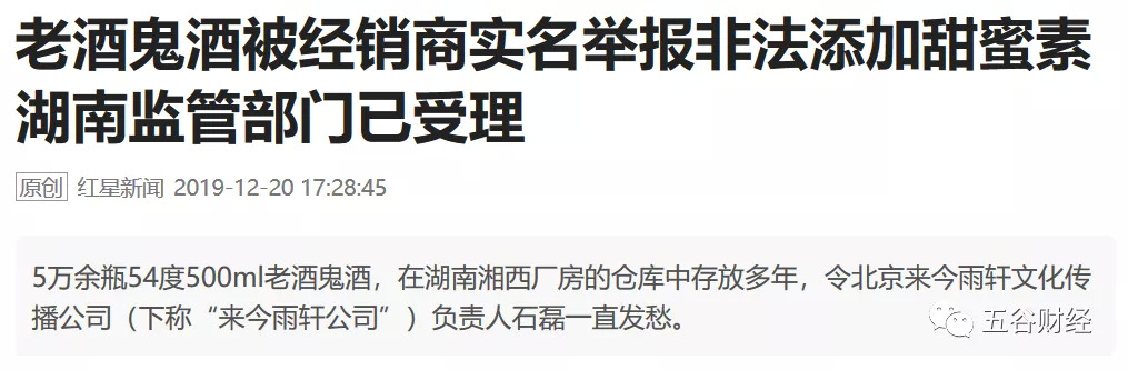 12月20日,红星新闻等国内主流媒体刊发了题为“老酒鬼酒被经销商实名举报,非法添加甜蜜素,湖南监管部门已受理!”的文章。