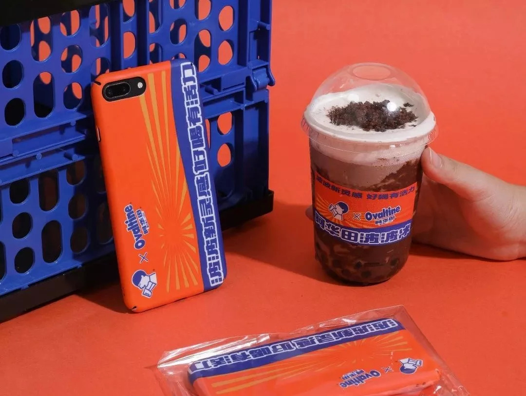 紧随其后,6月初,喜茶×阿华田,橘蓝黄相间的阿华田配色,唤起不少人的童年,产品及周边都受到消费者力捧。