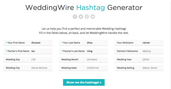 比如这个名叫Weddingwire的网站,它的首页上就罗列这一张表。只要用户填写自己的姓名和昵称、配偶的姓名和昵称、以及婚礼年月日、婚礼举办的地理位置等详细信息,网站就会自动生成一个独属于这对新人的标签。