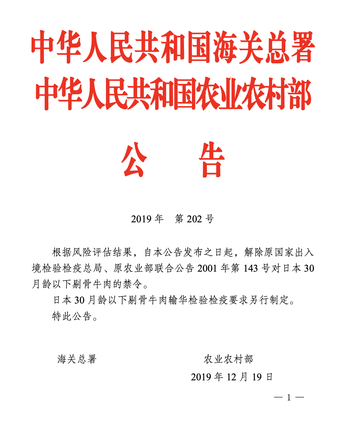 12月19日,中国海关总署农业农村部发布2019年第202号公告(关于解除日本疯牛病禁令的公告),称“自公告发布之日起,解除原国家出入境检验检疫总局、原农业部联合公告2001年第143号对日本30月龄以下剔骨牛肉的禁令。日本30月龄以下剔骨牛肉输华检验检疫要求另行制定”。