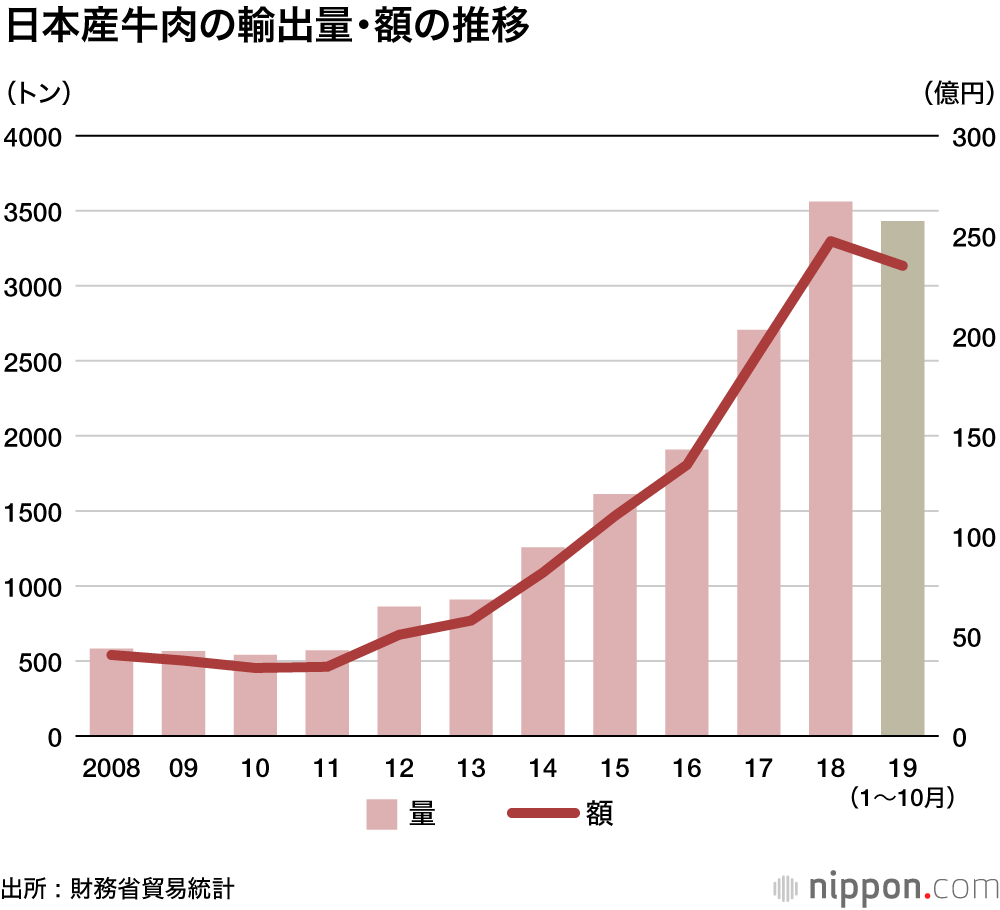 实际上,随着和食店在全球的流行,消费者愈发追捧“日本A5和牛”、“神户牛”等名头的光环,日本牛肉出口额整体呈上涨态势。2018年,日本牛肉出口量达到3560吨,销售额247亿日元,比前一年同比增长31.5%,3年增速超过2倍。2019年到10月份为止出口额已经达到3431吨。