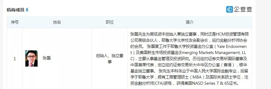 企查查显示,2019年12月3日,高瓴资本以股权融资的方式,参与到格力电器,完成了投资金额为416.6亿人民币的投资。其中,高瓴资本的创始人、独立董事张磊,还是HCM投资管理有限公司高级合伙人,耶鲁大学北京校友会副会长,纽约金融分析师协会的会员。张磊曾工作于耶鲁大学投资基金办公室(Yale Endowment)及美国新生市场投资基金(Emerging Markets Management, LLC),主要从事基金管理及投资研究。