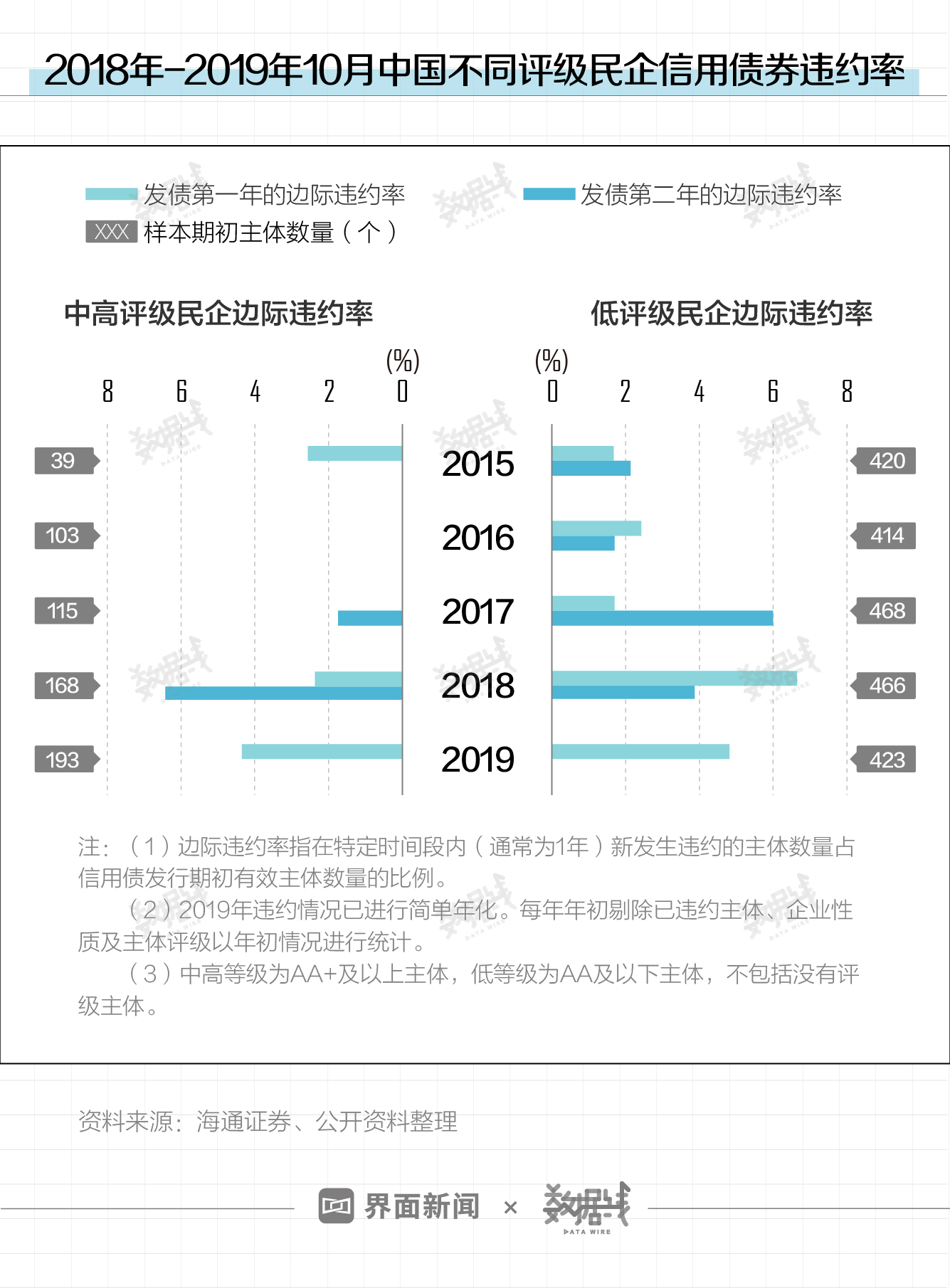 此外,数据还显示民企违约有逐渐向中高评级企业蔓延的趋势。据海通证券测算,评级为“AA+及以上”的中高评级民企,今年的边际违约率大幅上升,从2018年的2.38%上升至4.35%。 而低评级民企今年的边际违约率则有所下降,从2018年的6.65%回落至4.82%。如果以2018年发债的企业为观察样本,则中高评级民企在今年(即发债次年)的边际违约率反而更高:中高评级民企为6.43%,低评级民企为3.86%。