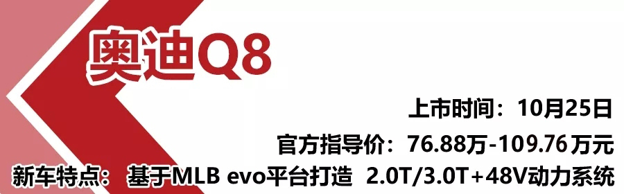 作为奥迪SUV家族的旗舰级车型,奥迪Q8于今年10月25日正式上市。奥迪Q8基于MLB evo平台打造而来,其采用了“Q”家族最新设计语言,八边形进气格栅、溜背式造型、贯穿式尾灯等元素都展示出Q8的运动气息。